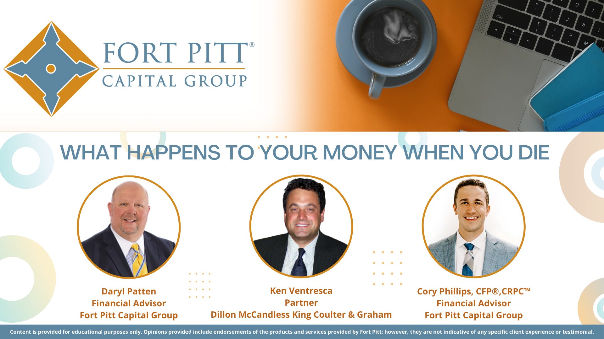 Fort Pitt’s Financial Advisors, Daryl Patten and Cory Phillips, CFP®, CRPC™ host Ken Ventresca to discuss the realities of what happens to your money when you die. The presentation covers: What happens to investment accounts when someone dies without a will? What happens to their debt? To whom should you make the first call to[...] Continue reading21 March, 2024