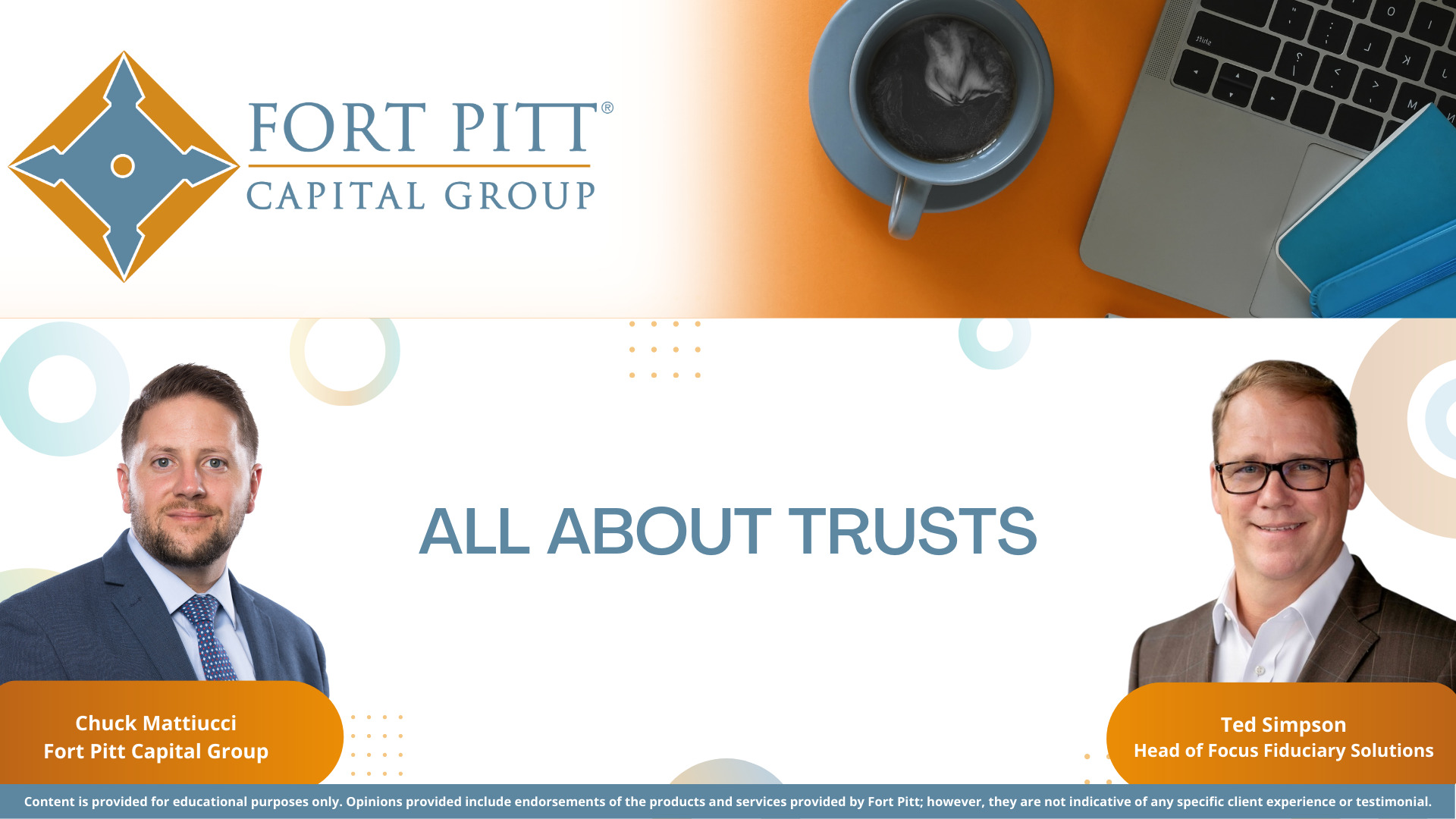 Join Fort Pitt’s Financial Advisor, Chuck Mattiucci, as he hosts Senior Vice President and Head of Focus Fiduciary Solutions Ted Simpson to discuss the things you need to know about trusts. They will cover a range of topics, including: What is a trust Common types of trusts and reasons to use them Who needs a trust How to establish[...] Continue reading26 April, 2023