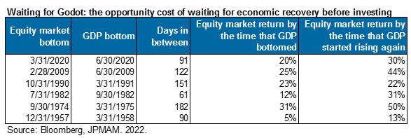 We will close with the most important point. The market is forward-looking and tends to bottom well before all the bad economic data and negative headlines go away. A look at the previous six recessions provides a solid illustration of that point. On average, the equity market bottomed almost 4 months before GDP bottomed, stocks were up 19% before GDP bottomed, and up by 31% by the time that the economy started to grow again.