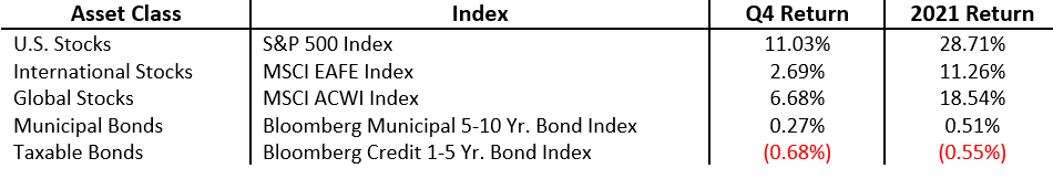 Below is a summary of fourth quarter and full-year 2021 performance results for several major indices: